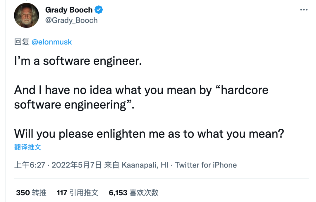 这并不是马斯克第一次强调“硬核”。早在今年 5 月份,他就曾在 Twitter 上表示,一旦他成功收购 Twitter,公司就将超级专注于“硬核软件工程”、设计、信息安全和服务器硬件。当时“UML 之父”Grady Booch 还曾质问马斯克,“硬核软件工程”究竟是什么意思。Grady Booch 是 IBM Rational 的首席科学家,其在软件架构、软件工程和软件建模方面有杰出贡献,并在国际上享有盛名。