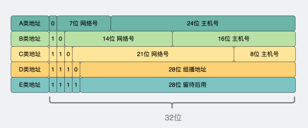 大概的意思是32位地址里,开头为0的,那就是A类地址。开头为10的,就是B类,开头为110的,就是C类。在这之后,把剩下的字节数拆成两段,一段表示网络号,另一短表示主机号。