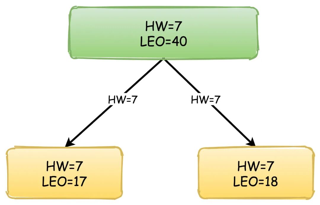 然后,消息还在继续写入,Leader的LEO值又发生了变化,两个Follower也各自拉取到了自己的消息,于是更新自己的LEO值,但是这时候Leader的HW依然没有改变。