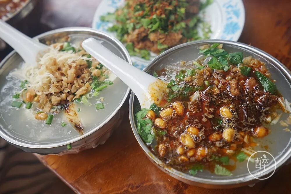 牛华豆腐脑的特点是在里头加了粉丝,上面加上香菜芹菜大头菜,还有脆黄豆,huo开以后一勺送进嘴里就惊了:啷个会这么好吃?!
