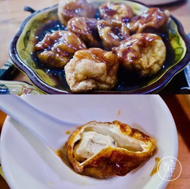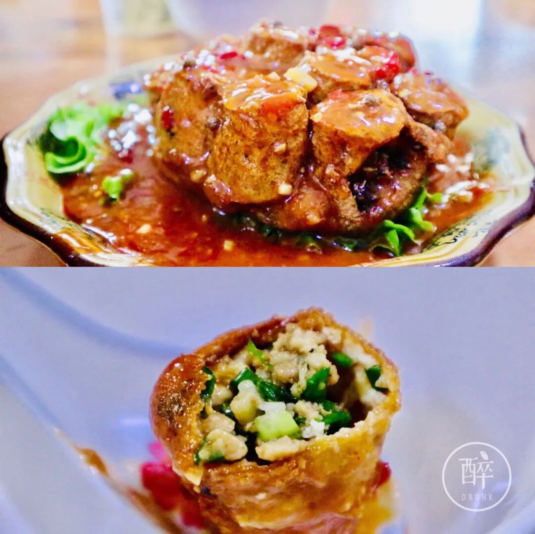 两个豆腐很好吃。灯笼豆腐,一层有韧劲的被油酥得略香脆的豆腐皮子外壳中包裹着葱香肉馅,外面勾了鱼香味酱料,色香味形都可圈可点。