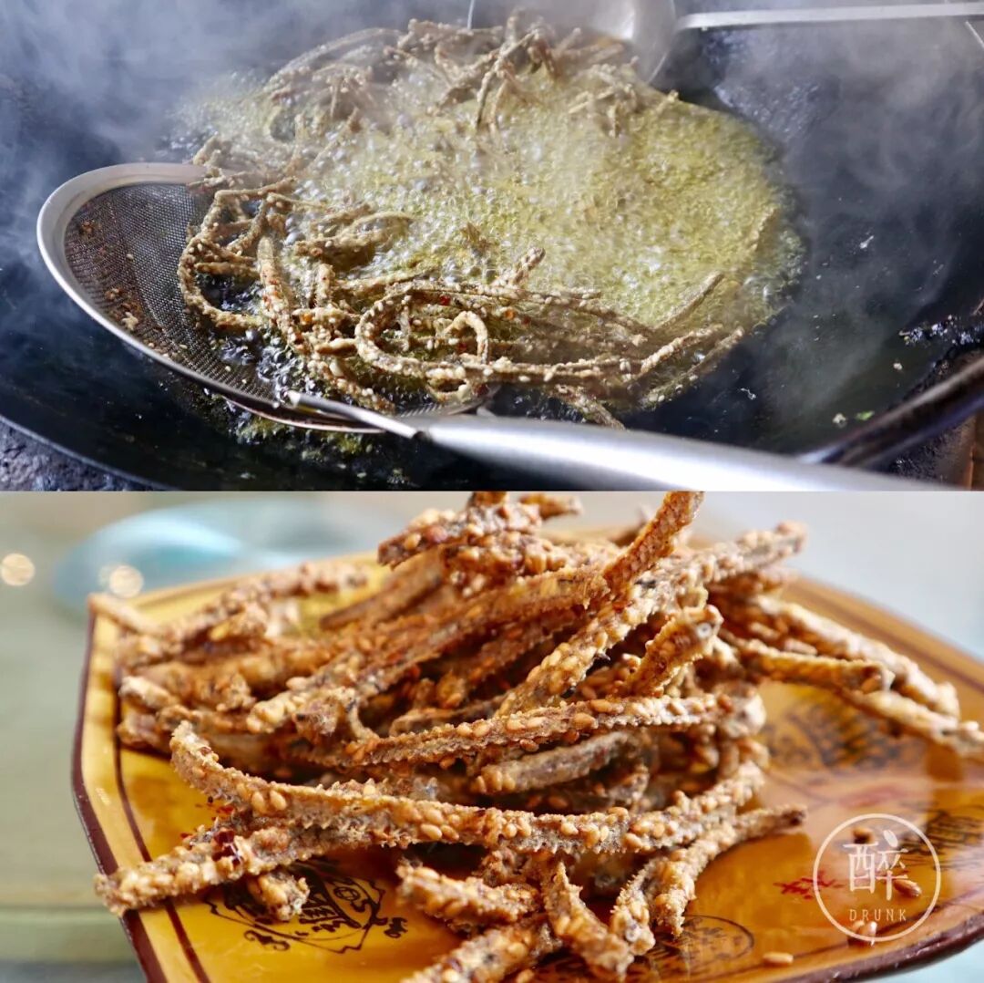这鳝鱼还真像是小土鳝鱼,细细小小一根根的。炸鳝鱼骨头外头裹了芝麻,香麻酥脆,多要了一份打包拿回家下酒。