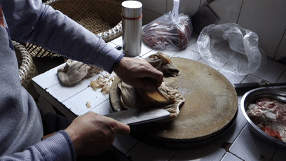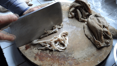 后厨一位大叔,正在切新鲜的水牛毛肚。
