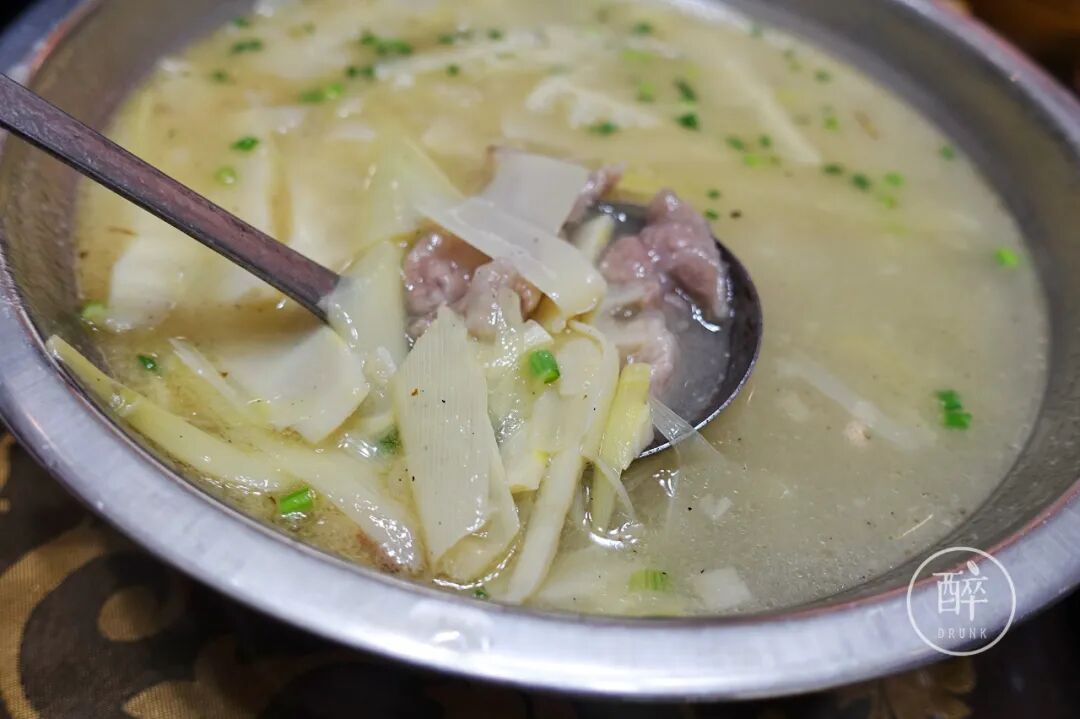 他们家的苦笋肉片汤,底汤是鱼汤,太鲜了……苦笋新鲜得要命,片得超薄,清新中带着淡淡苦味。
