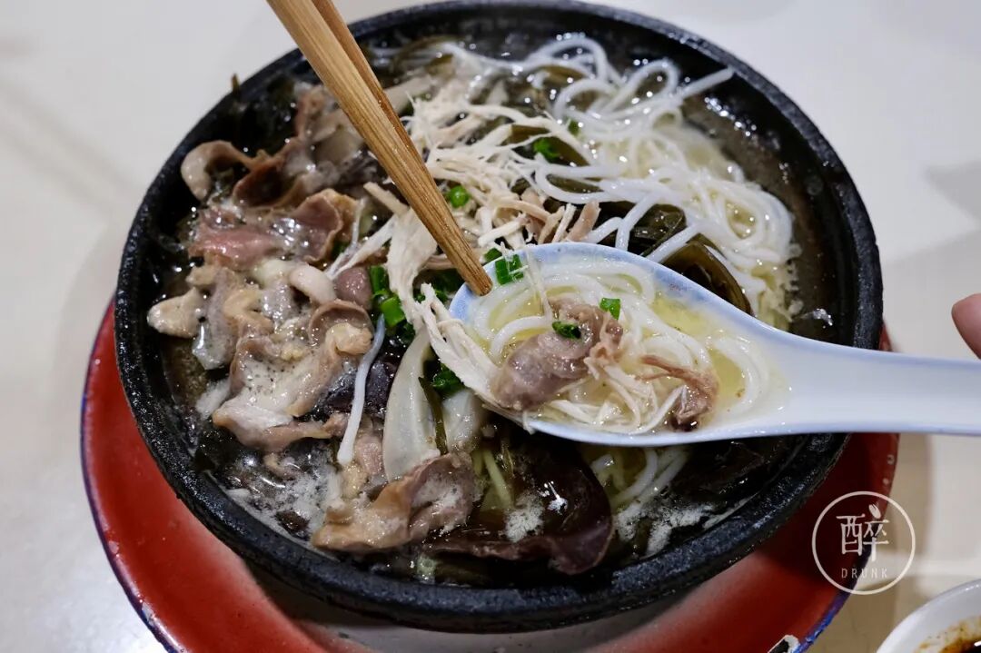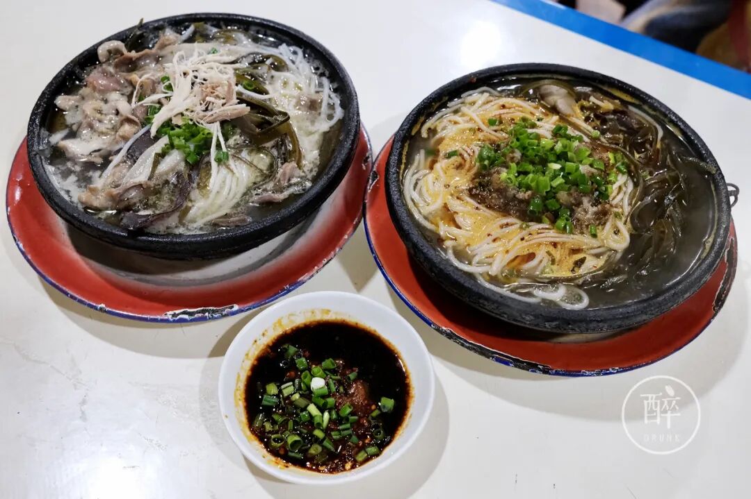 看起来有点不起眼?鸡丝米线加珺肝,右边这个红汤的很好笑,有个专属的名字叫「美味」。