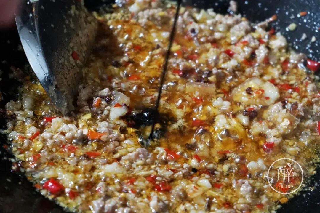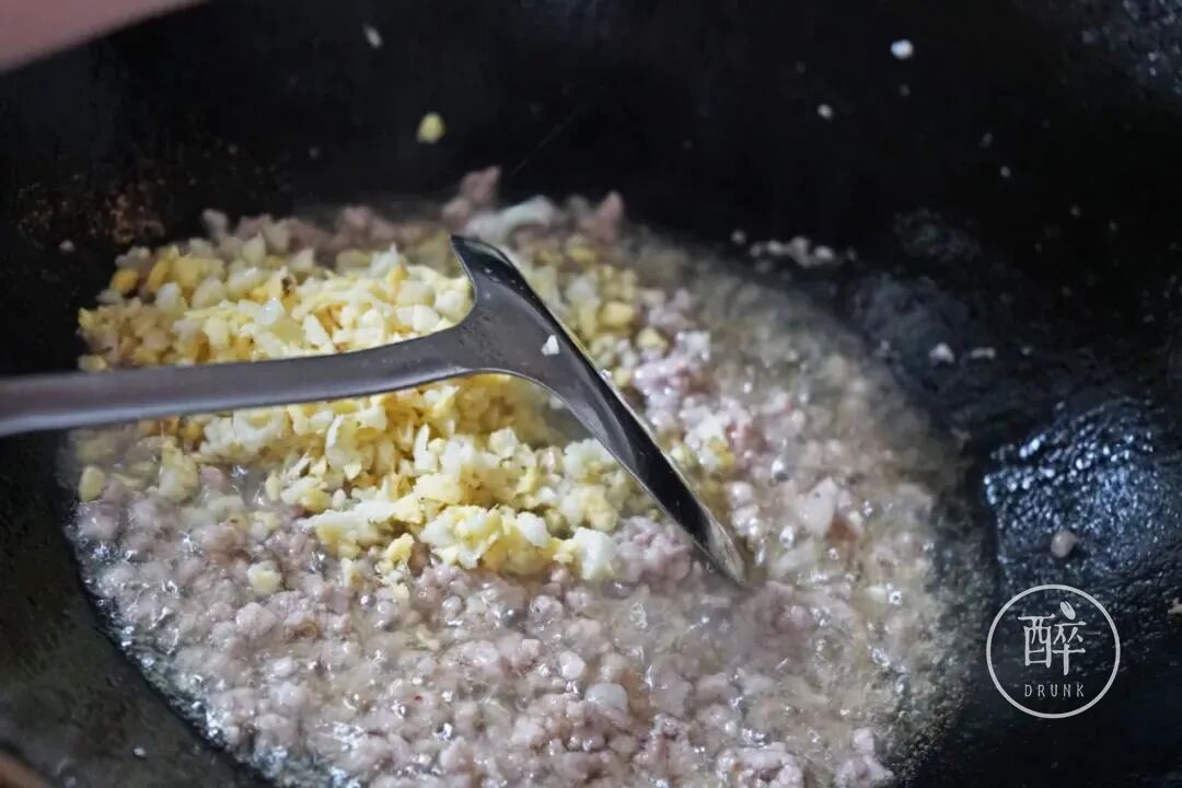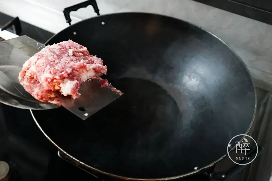 热锅烧宽油,烧烫之后直接倒入宰好的肉沫,翻炒翻炒,让肉沫稍微酥一下。