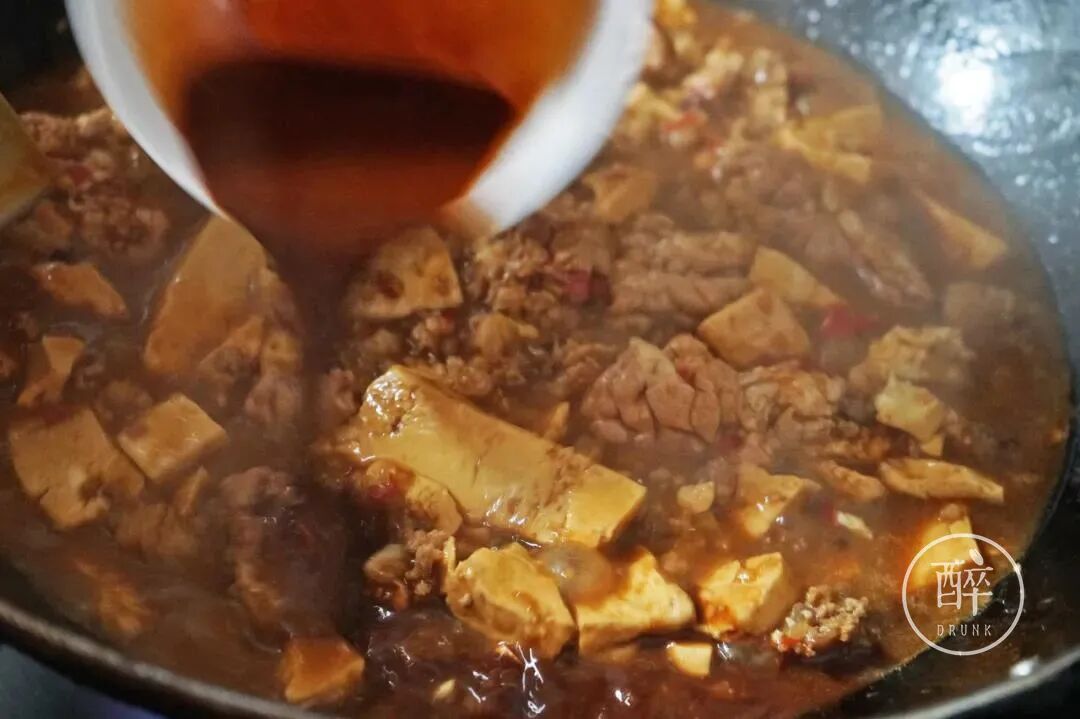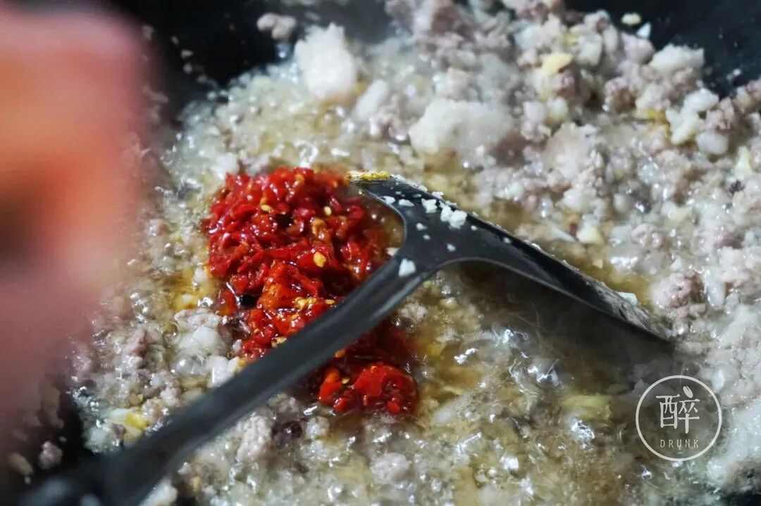 炒料开始,正儿八经的麻婆豆腐,肉沫用宽油+郫县豆瓣炒香,郫县豆瓣是酱香味,不辣,主要起到提色的作用。