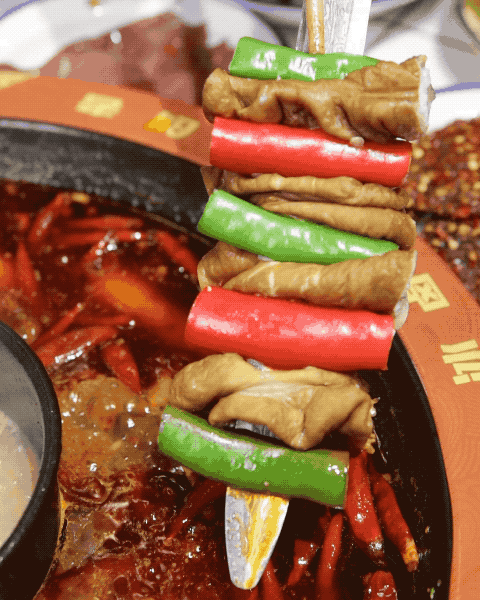 宝剑上面的肥肠,本身就是卤过的,一筷子ma下去煮在红锅里面最巴适。