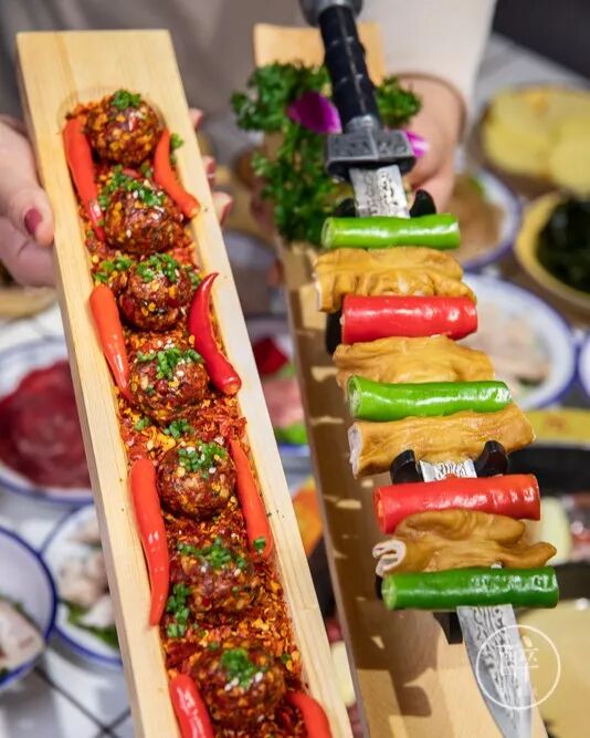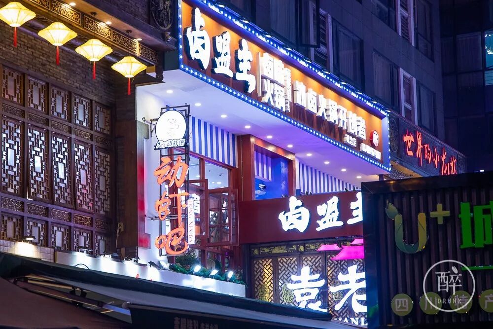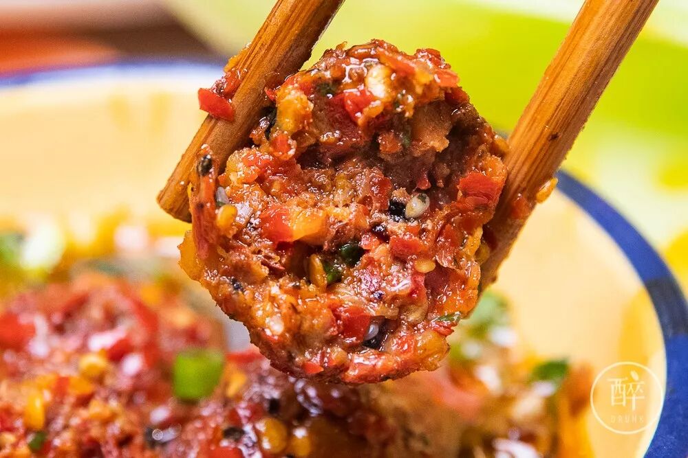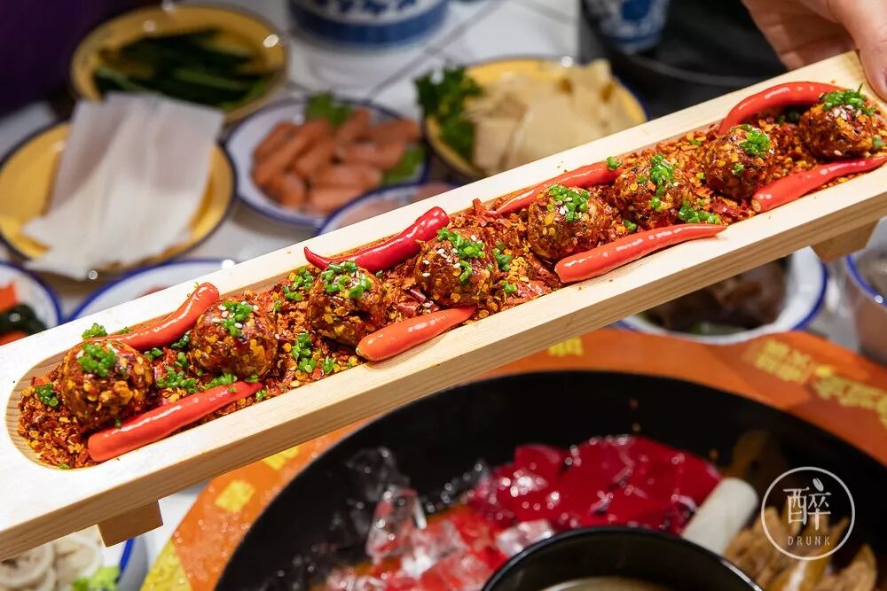 大家请品穿起卤肥肠的宝剑、铺满辣椒面的肉丸子......