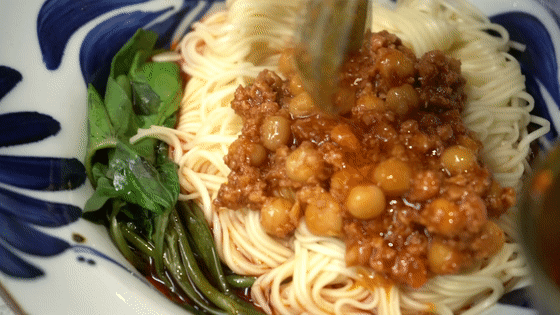 煎出来的鸡蛋刚刚好有点流心,软绵绵的滴到杂酱面上头。随意加的绿色蔬菜恰到好处的综合了下对菜叶子的需求。