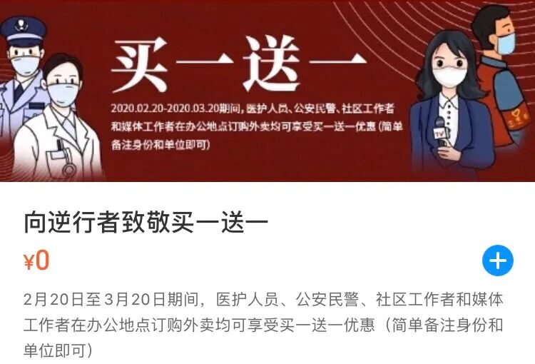 在点餐平台上,还可以看到致敬逆行者,几类职业在办公地点订外卖,都可以享受买一送一的折扣。