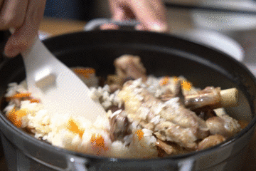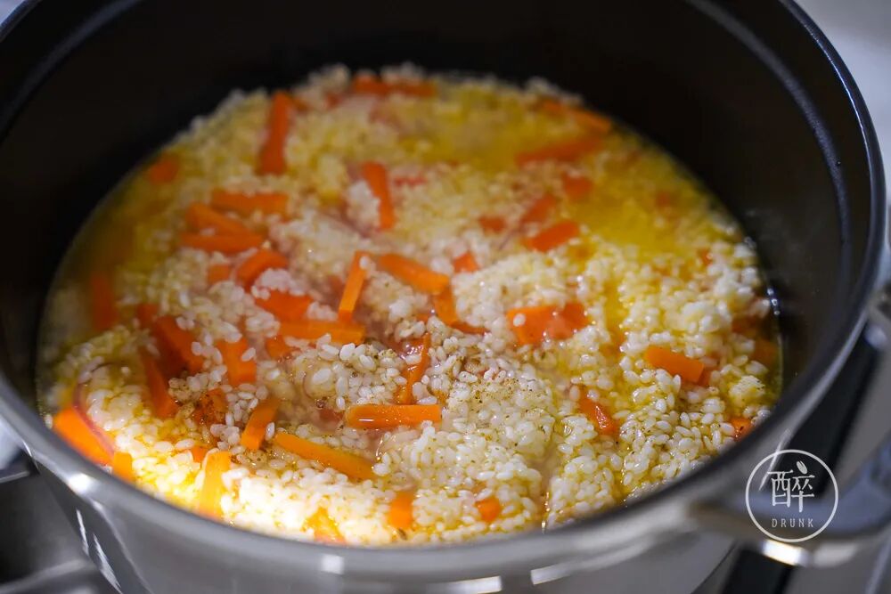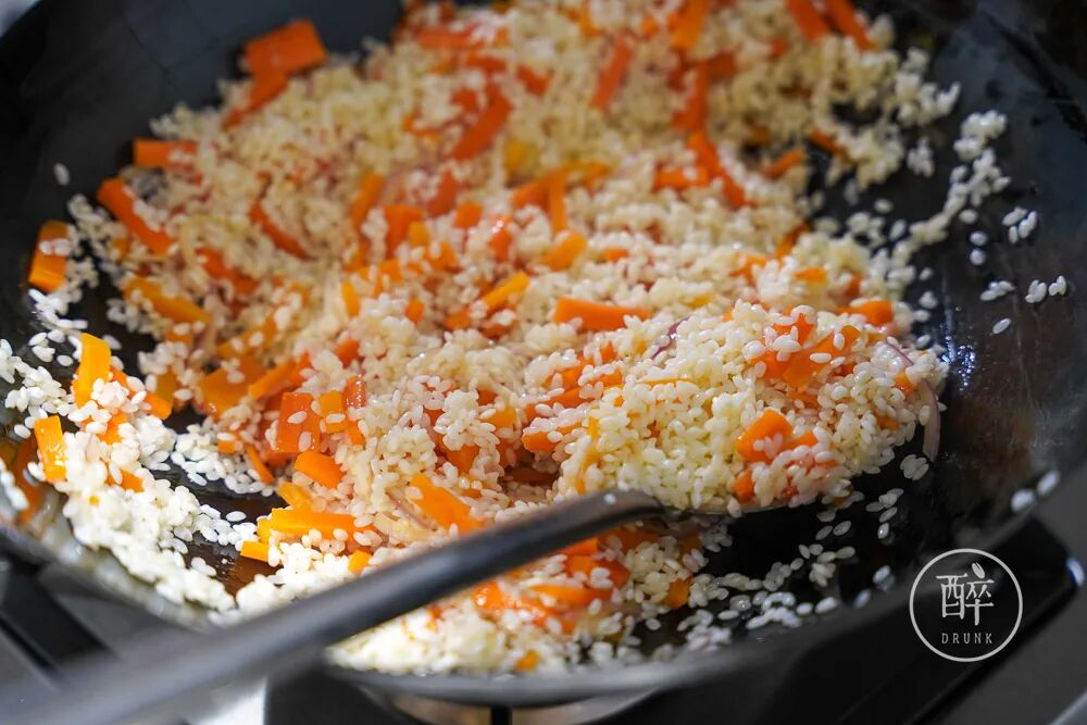 再把配菜和米也稍微炒一下,吃起来会更油润。