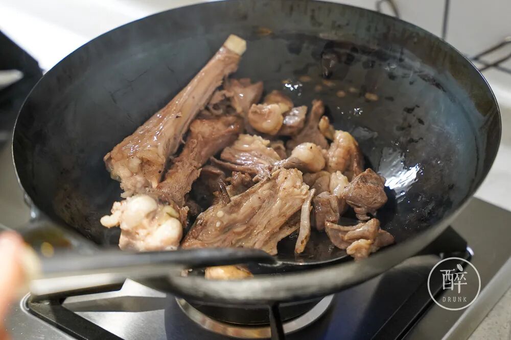 先把羊肉热油炒过,有排骨就上排骨,没有就只用肉丁~(我们用的腿肉)