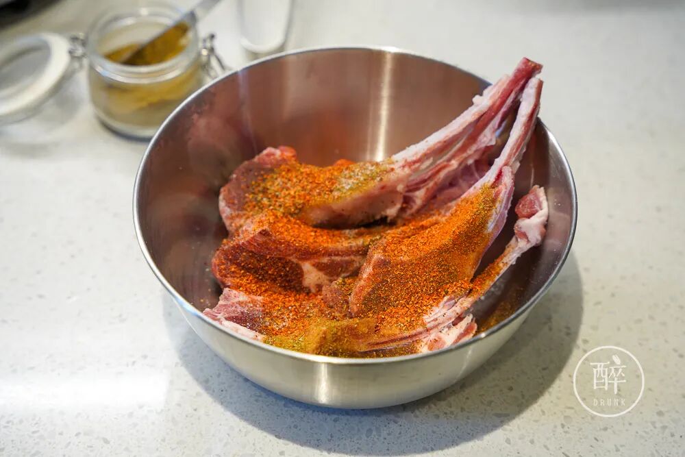 盐和花椒粉1:1小伙炒出香味,均匀抹在洗净吸干水分的小羊排上,再抹多多的孜然粉和辣椒粉。