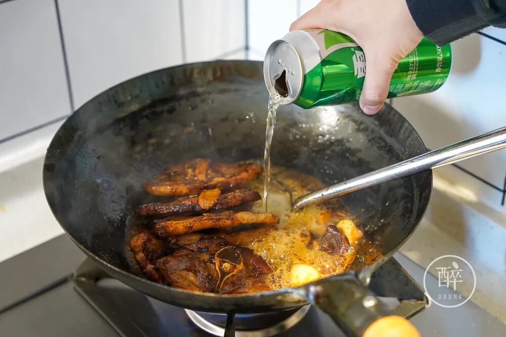 先用冰糖、姜蒜花椒豆瓣过油翻炒,炒香以后加一罐啤酒焖煮。
