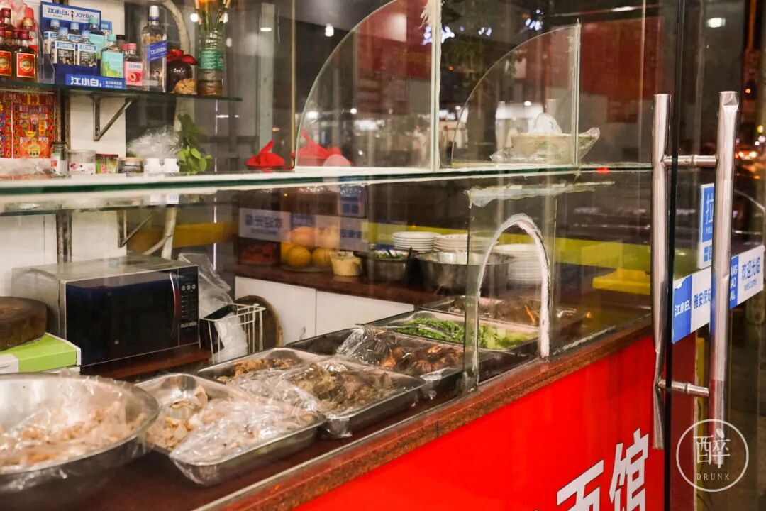 进店门口的收银台旁边,就是专门的凉菜档,可以看到煮好的鸡肉、猪耳朵等等食材。