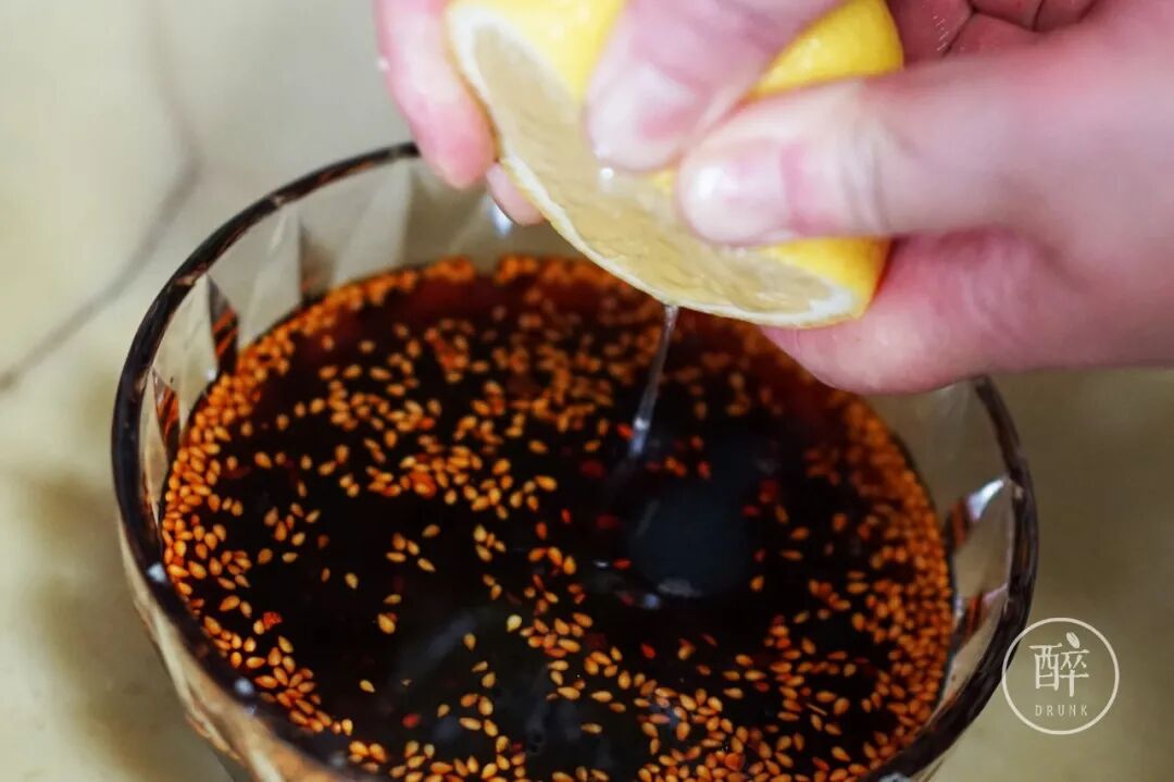 加入白醋、花生油、白糖、鸡精、盐(多放点),挤半颗柠檬,兑成一碗川式酸辣调料(顺序可以随意)。