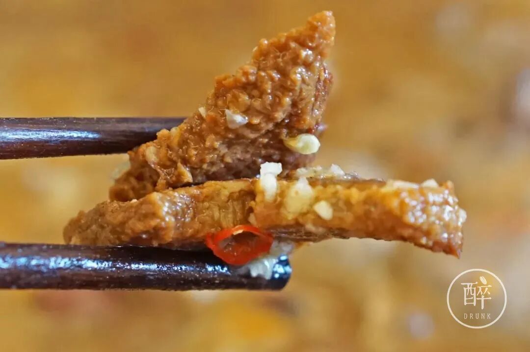 炸过的腌制后的带皮五花肉,表面有一点点焦,酱味浓郁,配起豆香四溢的汤底。