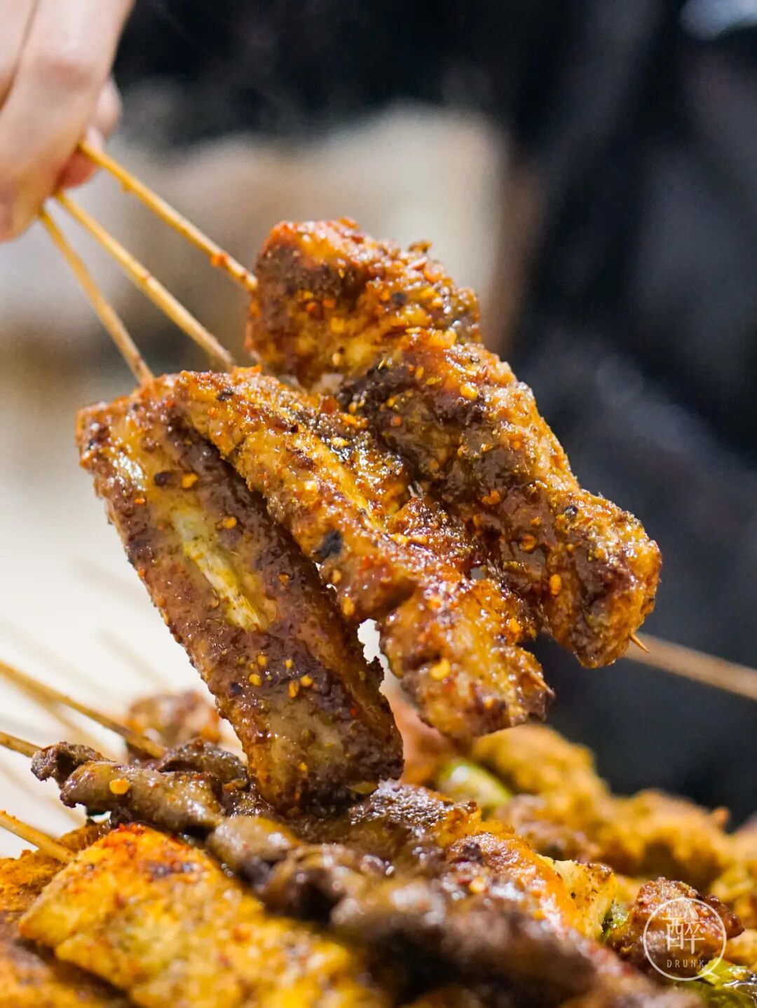 其他烤串儿里头,五花肉、鸡皮、鸭舌,都是烤脆到焦香那一挂的!