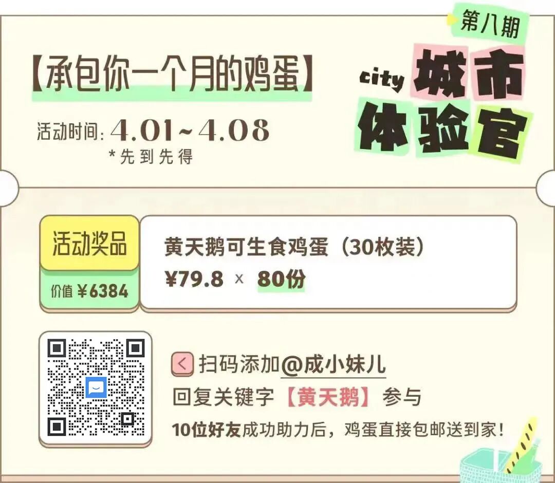 直接承包你一个月的高品质鸡蛋!一共80份「黄天鹅可生食鸡蛋(30枚装)」,总价值¥6384。