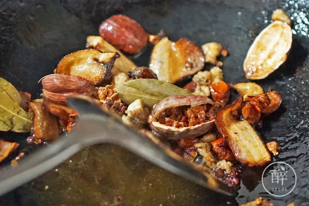再将八角、草果、香叶、花椒倒进去炒出香味后,加入姜片、蒜、小米辣继续炒香。