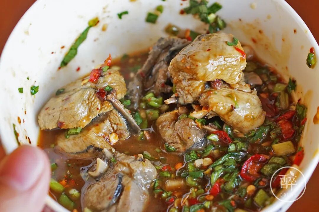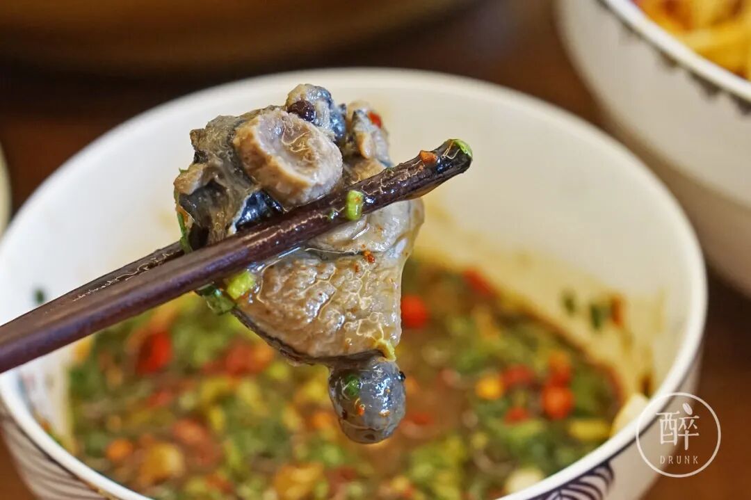 蘸酸木瓜火腿鸡,在烧鸡的风味上增加酸味的存在感,辣味先入口感觉到的是小米辣的辛辣,再是一丢丢辣椒籽籽的辣意。