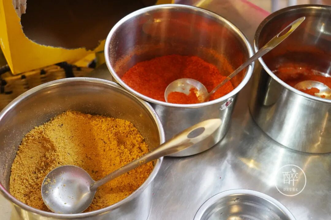 左边那个黄色的粉末,是用桃酥碾碎+咖喱+孜然……等等好多调成的。
