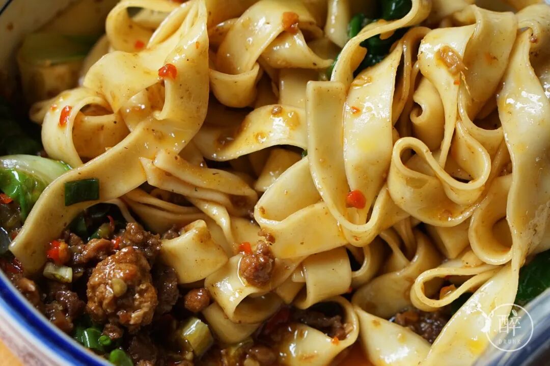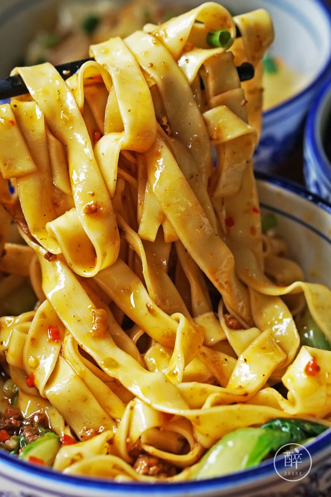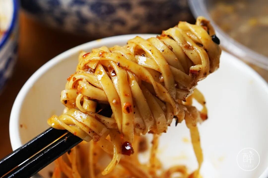但有浓厚的熟油海椒香味,水叶子面比宽面更容易裹油,煮面的程度是我喜欢微微过心再耙一点点的程度。