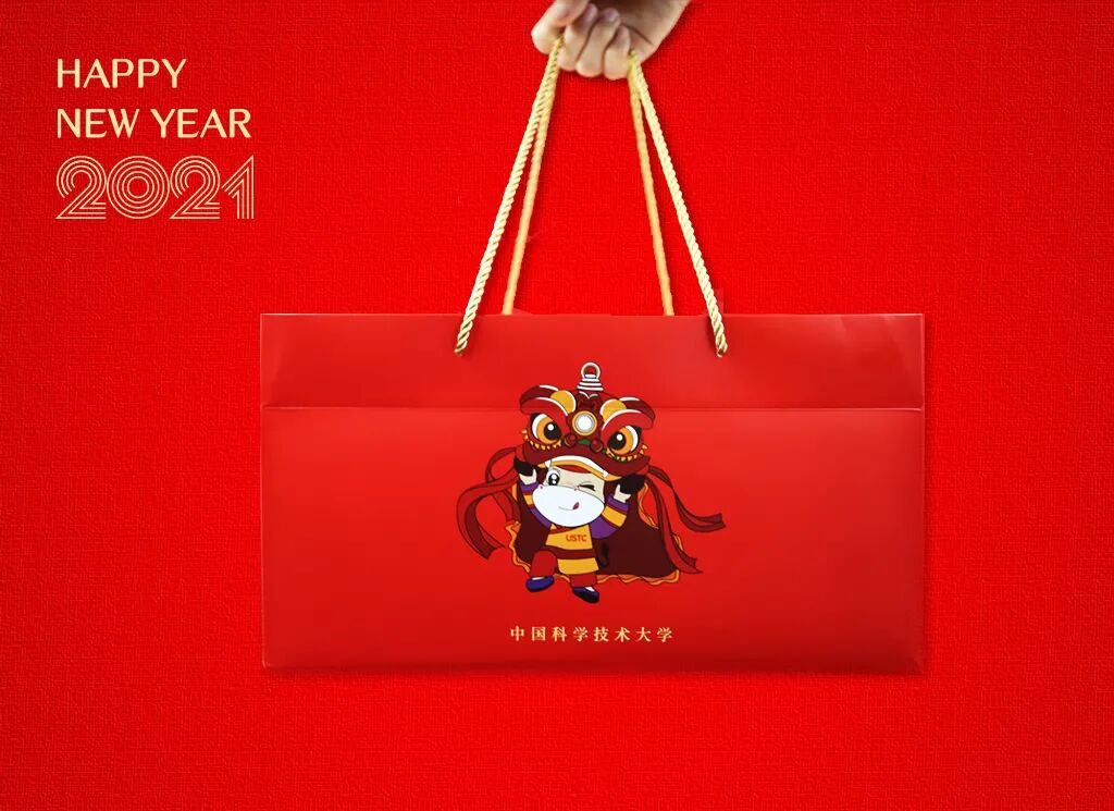 这是一份印有科大小牛的红色礼袋