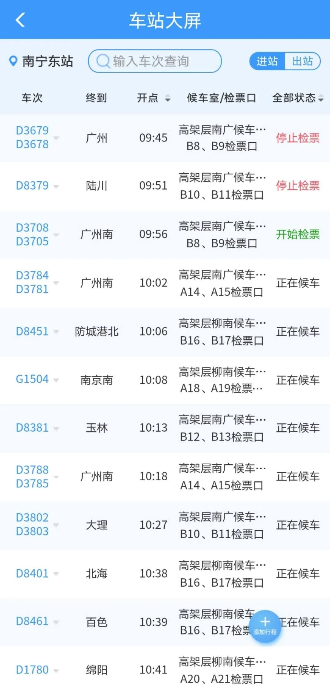 点开12306APP中的“车站大屏”,迎面而来就是这样一个界面。“车站大屏”包含进站/出站两个界面。