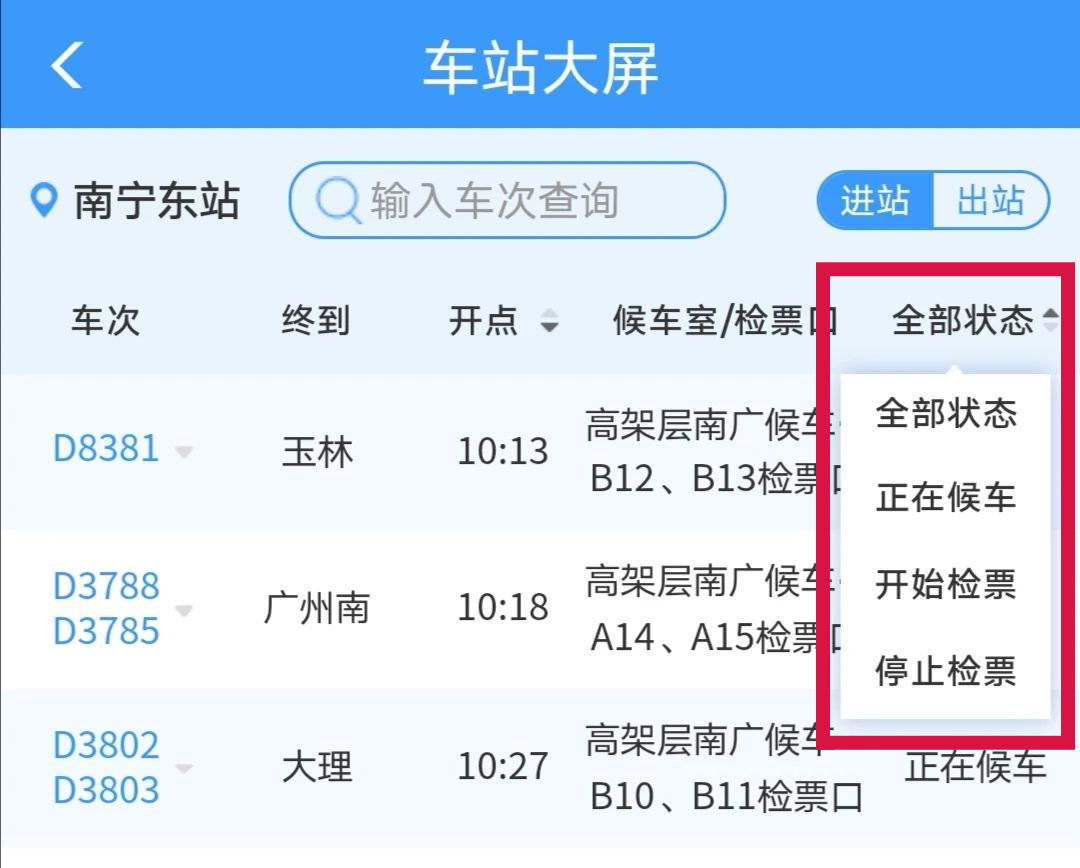 点击标题栏,可以对车次进行简单的排序与筛选。比如“开始检票”,点开后就会弹出“全部状态”/“正在候车”/“开始检票”/“停止检票”等状态选单,选择其中一项即可将不相关车次快速屏蔽。