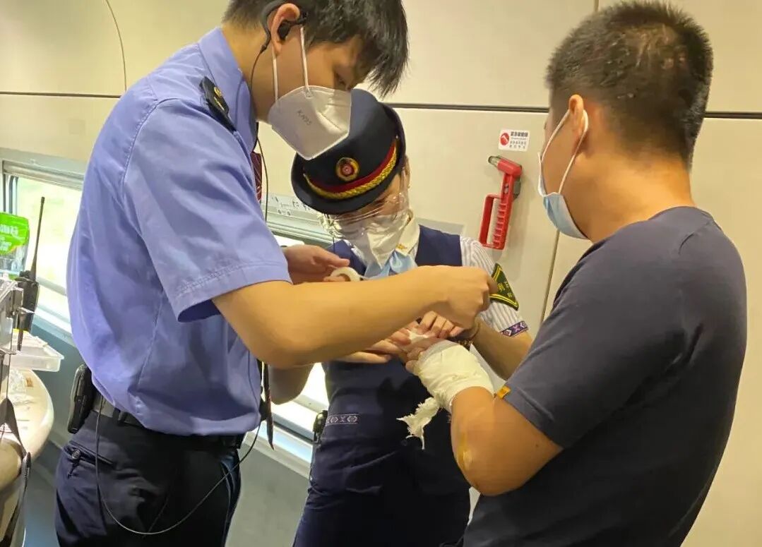 受伤旅客罗先生是一位警务工作者,当天乘坐动车外出执行任务。在骑车赶往火车站途中,罗警官避让行人,导致摔伤。为不耽误工作,他顾不上疼痛,带伤赶上动车。