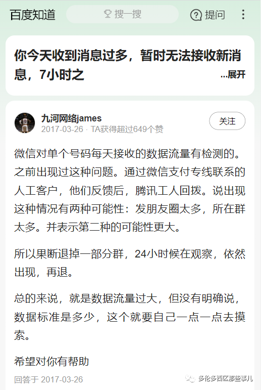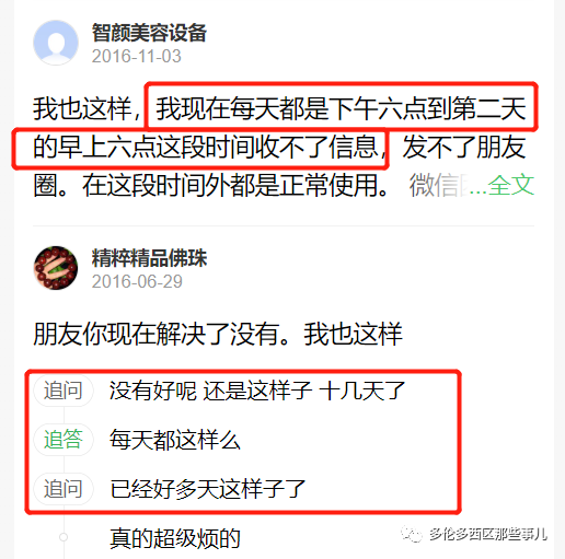 而且受影响的用户似乎别人给他们发消息时,会显示被删除或拉黑后出现的红色感叹号……有经纪就赶紧在朋友圈里澄清:“如果给我私信的朋友和客户看见红色感叹号,一定不啊哟误解,不是我拉黑你们!”对于微信出现的这个问题,有网友的解答是,微信对单个号码每天接受的数据流量是有检测的,腾讯人工客服认为出现这种情况有两种可能:一是朋友圈发太多,二是所在的群太多。不过百度知道里也有很多网友表示,在收到微信的这种消息后,之后的每天都会收到类似的消息,然后在规定的时间里就不能接收新消息了!虽然网友建议可以试试退群,不过也有网友表示,自己都退了几十个群了,还是不行:有网友描述自己每天被封16个小时,错过了几十万的纯利润,客户都跑光了。气得破口大骂微信不讲武德。
