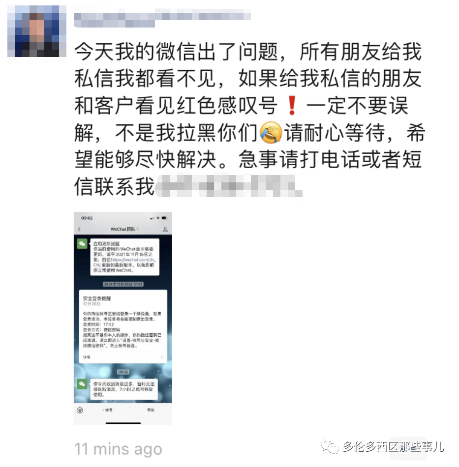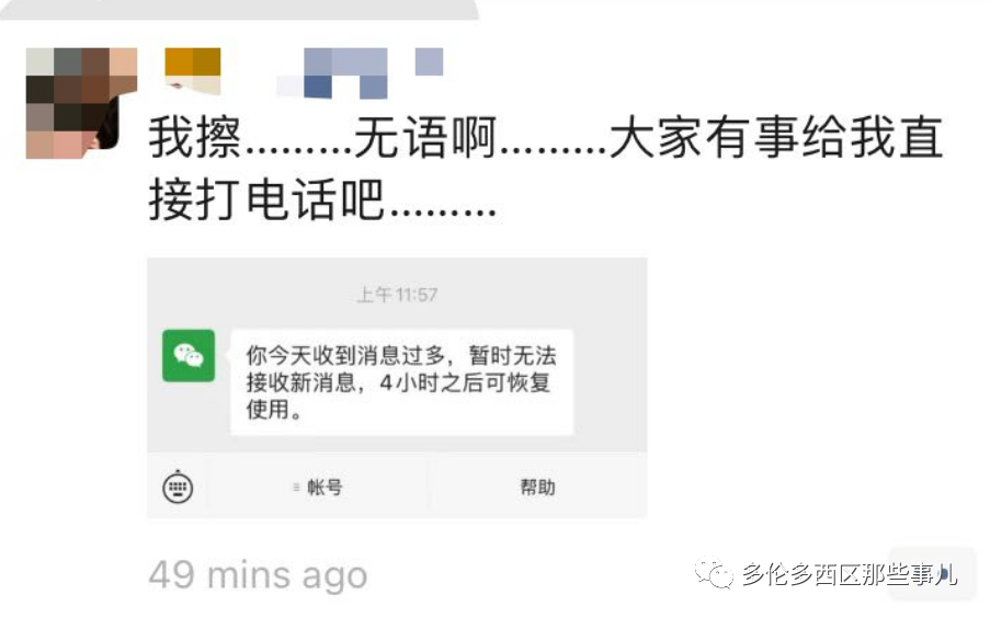 不仅不能接收新消息,也不能发消息了,不管是私聊还是在群里,都被禁言了!由于不少受到影响的华人用户是各种经纪,所以微信上找不到人,生意也受到不小的影响。![]()