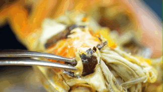 选活蟹、精挑公母比例、手工现拆,蟹壳熬油……首先挑清水大闸蟹,选肚子饱满为佳,这种膏多肉厚,大小要求 3.5 两以上: