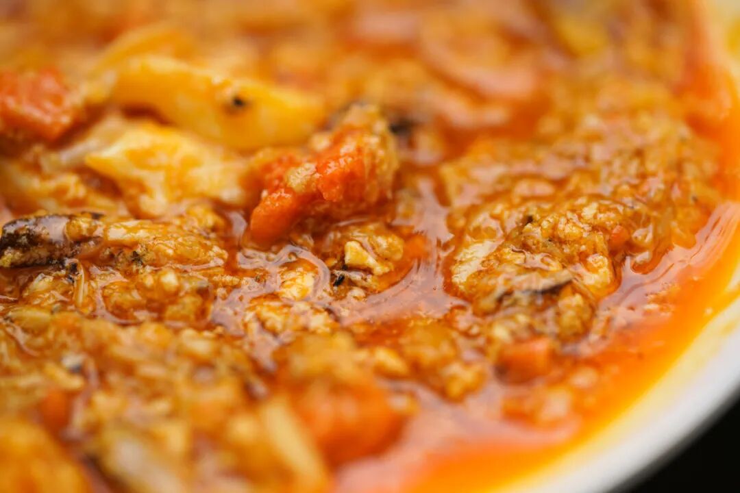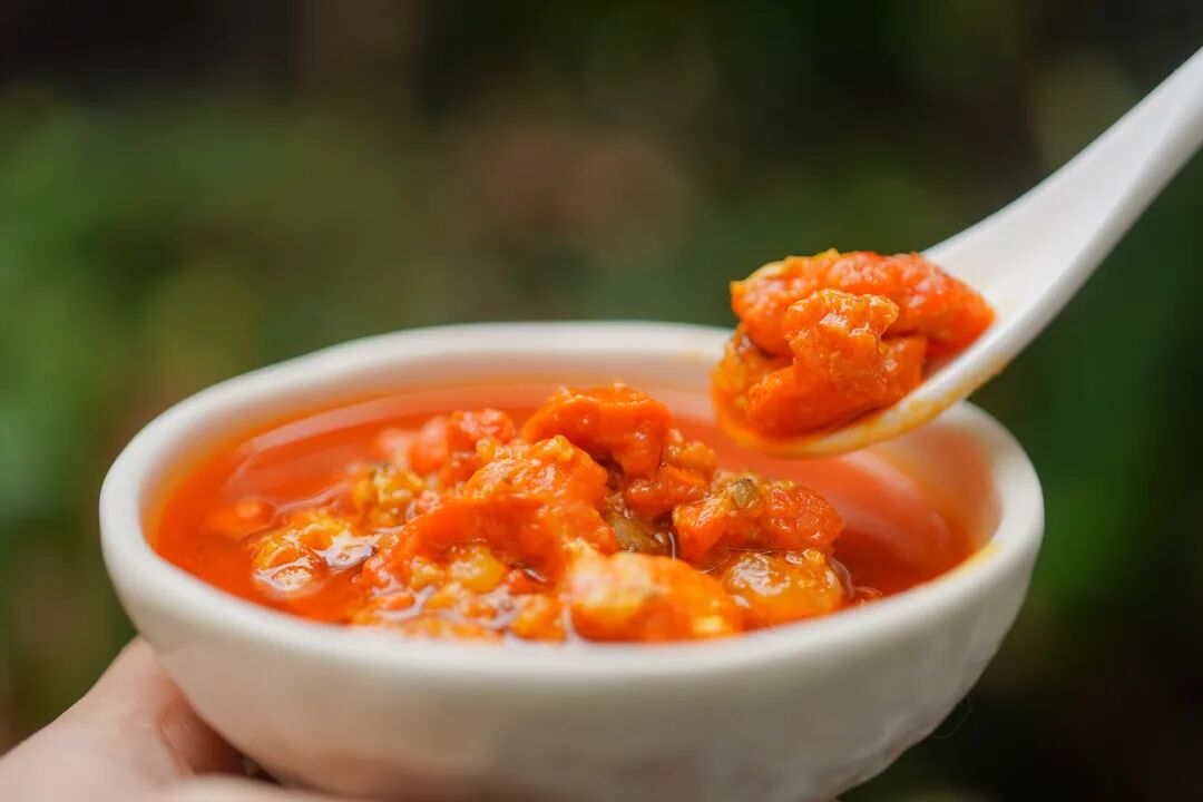 蟹壳来熬个红亮的蟹油,这样能吊出独特的鲜香味。工厂定制的时候,我们特地保留了这个工艺。
