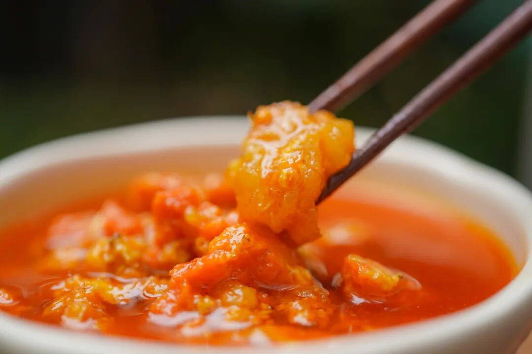 活蟹现拆,手工熬制,膏肥黄多,蟹油香浓,足足用了 24 斤清水活蟹拆出 1 盒 400g 的秃黄油,浓郁的香味会从鼻子和嘴巴间跑进胃里。