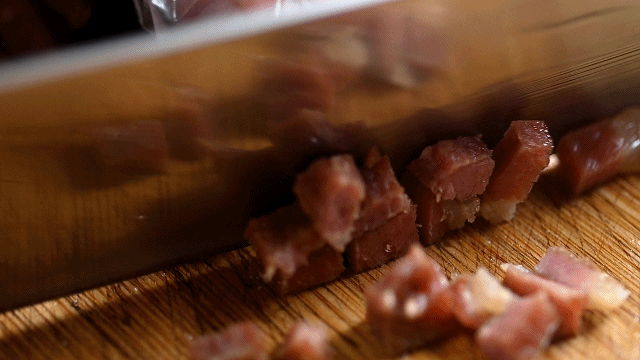 我图省事差点用直接绞肉机一弄。老师傅在笔记里说,千万不能像市面上那种绞碎像肉糜一样的,再好的火腿都弄的不像样了。