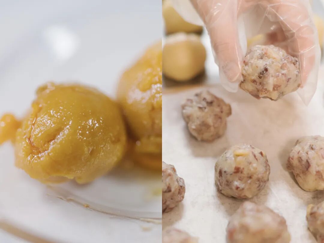 此时已经足够鲜香的火腿酥内馅就完成了。逐粒称重,确保足有四两坨。
