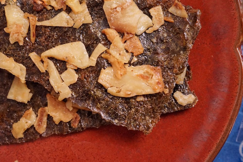 海苔的咸鲜和榴莲的香甜,竟然还蛮搭的。脆片经过烘烤酥酥的,和海苔脆脆的口感搭配,咸中带甜,滋味变化无穷。