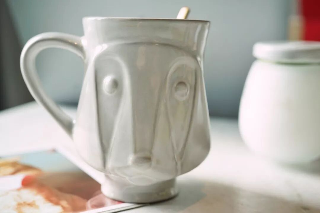 杯子如人,也有不同的性格。这只杯子就比较中性,造型几何立体的雕塑感很强的狗头,眼神呆萌,放在办公室总是不经意和它对望: