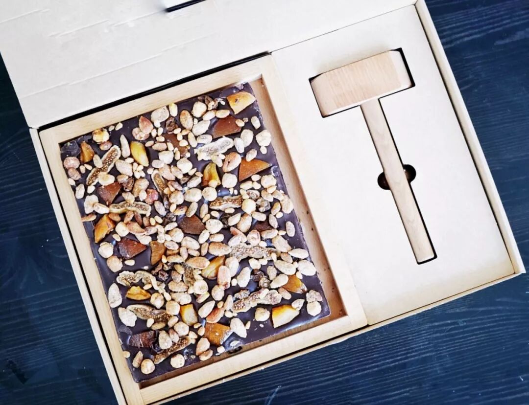 做巴黎名店巧克力时,就被这块木槌巧克力吸引了。背面铺满了坚果,而且配了一把小木槌,可以敲开巧克力分着吃~