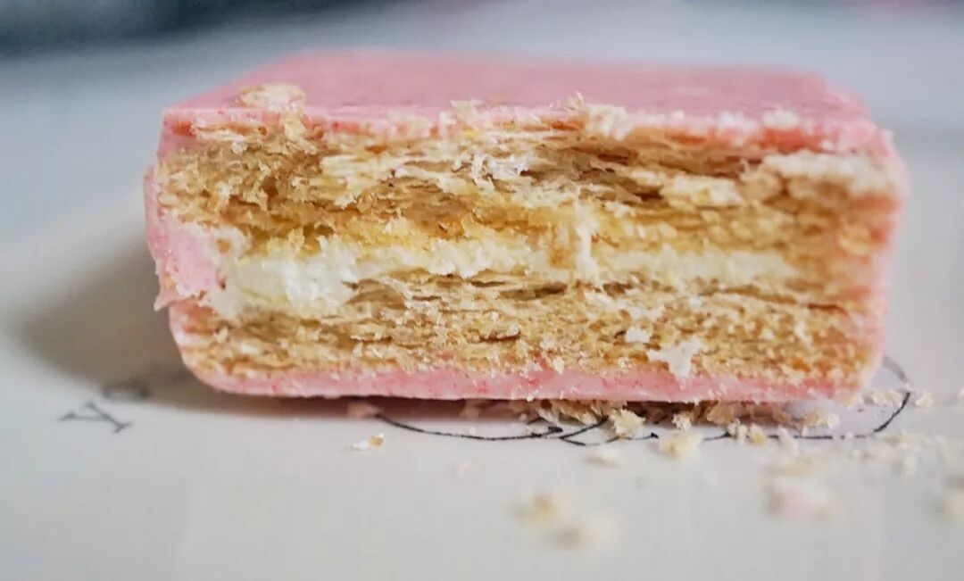中间一层牛奶夹心,两边厚厚的威化,最外面裹着一层浓郁的草莓白巧,香甜酥脆。就是很容易粘手,有点遗憾。