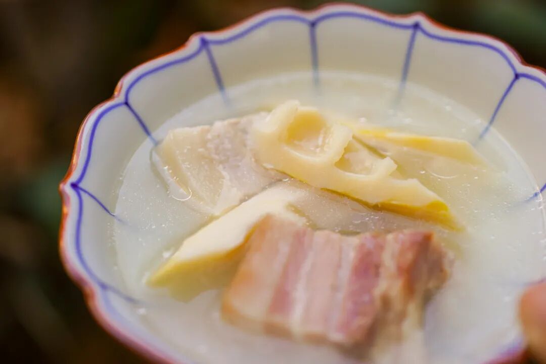 嫩生生的,透着一股春天独有的清香,洁白的笋肉,炖一盅 super 鲜的腌笃鲜,一勺一勺把汤喝光,把笋吃光: