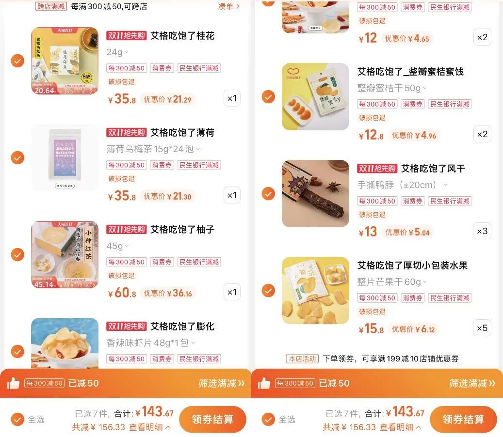 3款零食包组合任选其一,最低到手245.1元。➕清仓特惠吸吸果冻10袋。到手二十几件,仅需277.8元!!还送小花手挽包~喜欢吃肉肉零食的朋友嘛,一定要选零食包C「馋嘴怪肉食礼包」!!零食包C!肉零食平时贵,以下全部买到手单件仅有十几块~上新会员功能,有3大好处,①领优惠券②可以累计积分兑换③方便双十一更大程度的薅羊毛!双十一在店铺充值购物金,充245得250、充475得500、充750得800,充值后一年内都可用,如果发现用不完,也是可退的~不过在这里提醒下,购物金是会员专享,所以记得申领会员呀!99元任选12件、🍃2件8折茶类专区。全部可以叠加🈵️300-50折上折。年度地板价给到大家,买的开心实惠。🥰 99元任选12件零食专区,必囤的手撕鸭脖、鲜脆虾片,蜜桔干芒果干小朋友都爱吃。🍃 2件8折茶类专区,囤茶的朋友来。去秋燥的马蹄水罗汉果普洱,甘甜甜很好喝;新品柚子小种红茶;糯香普洱茉香大麦桂花雪梨草莓波士茶重瓣玫瑰……通通2件8折,还能叠加跨店满减~今年双11,最后8小时。一年仅一次,错过不再来。大家现在马上加购,不要错过啦!!更多购物车直接这里抄作业🙋