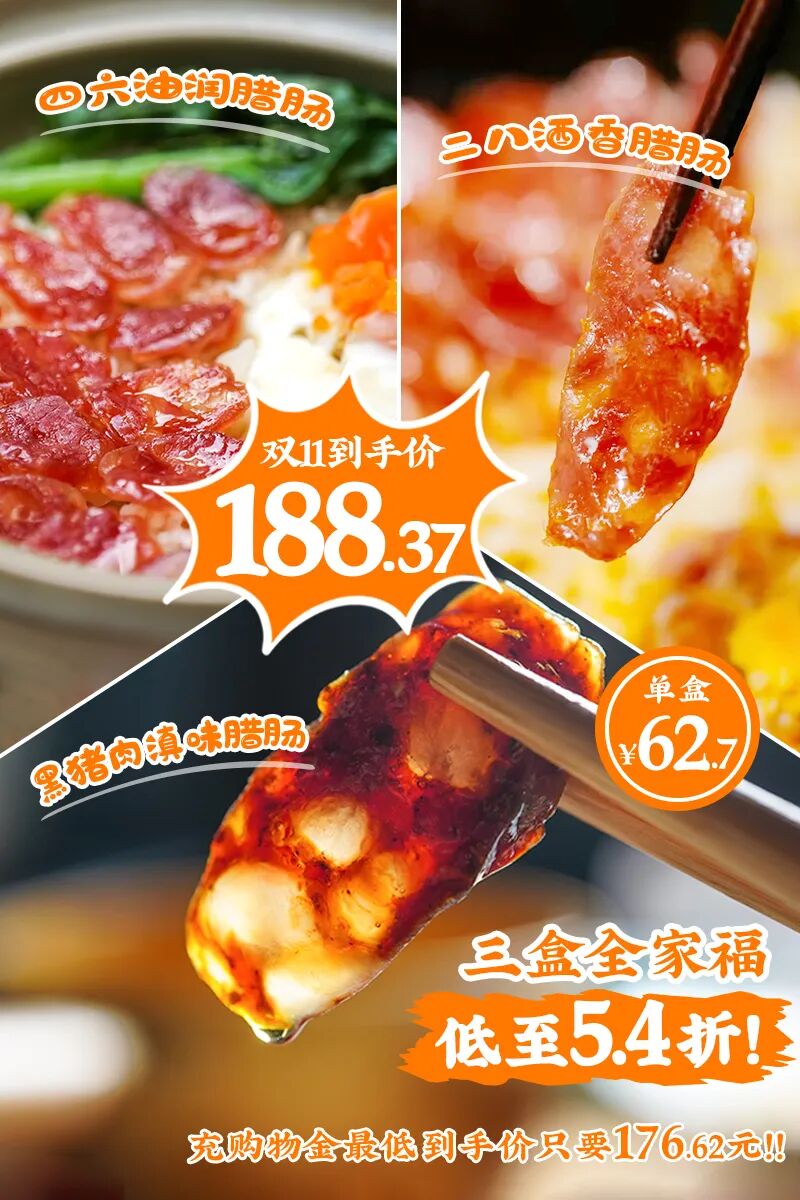 想尝鲜的朋友,看这里一样划算。手剥山核桃*1核桃仁*1,拍二;凑单3包葱油拌面,直接🈵️300-50。四罐山核桃到手仅需212.2元,单罐到手53元!今年肉类销量最好的是「滇味黑猪肉腊肠」🥩肉香&鲜麻&香辣&酒香交织,此起彼伏,香气一层又一层涌来,醇厚迷人高潮迭起。还有大家熟悉「二八酒香腊肠 」酒香感更浓郁,四六肥瘦比「广式油润腊肠」,适合炒菜!以上三个口味,组合购买真的很划算,几乎快要打了个对折!「滇味黑猪肉腊肠、四六油润腊肠、二八酒香腊肠」双11打折有巨大折扣!