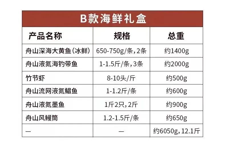 👍 B款是至尊海鲜礼包,总重量12.1斤。品质规格都很顶,相对适合聚餐送礼、大家庭食用!
