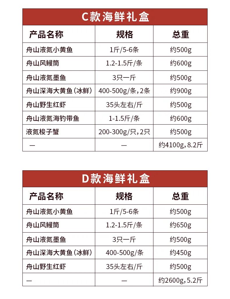 😋 C款小资年菜礼盒D款东海渔鲜尝鲜礼盒,品类丰富规格较小一些。适合2-4人的小家庭食用:
