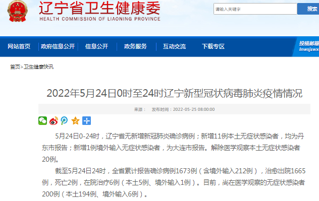 5月24日0-24时,辽宁省无新增新冠肺炎确诊病例;新增11例本土无症状感染者,均为丹东市报告;新增1例境外输入无症状感染者,为大连市报告。解除医学观察本土无症状感染者20例。