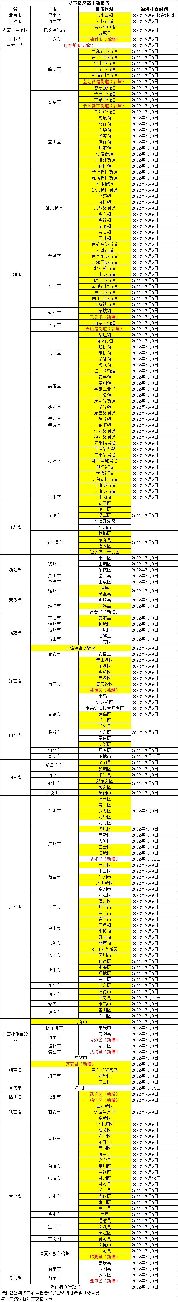 黄底为有中高风险区的城市,中高风险区以国务院客户端实时更新为准